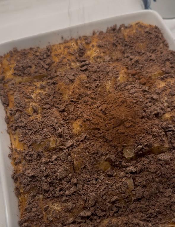Lad baklavaen trække i 3–4 timer. Drys med revet mørk chokolade, kakao og evt. lidt ekstra pistacie inden servering.